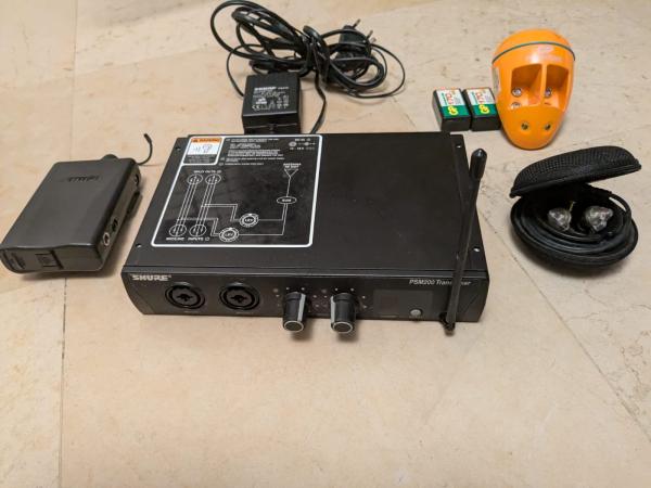 מערכת מוניטור אישית אלחוטית של Shure מדגם PSM200 במצב מצוין. המערכת כוללת משדר, מקלט נייד, אוזניות in-ear SCL2 ושנאי - כולם מקוריים של Shure.נותן במתנה גם מטען אלחוטי לסוללות 9V עם סוללה נטענת למקלט.